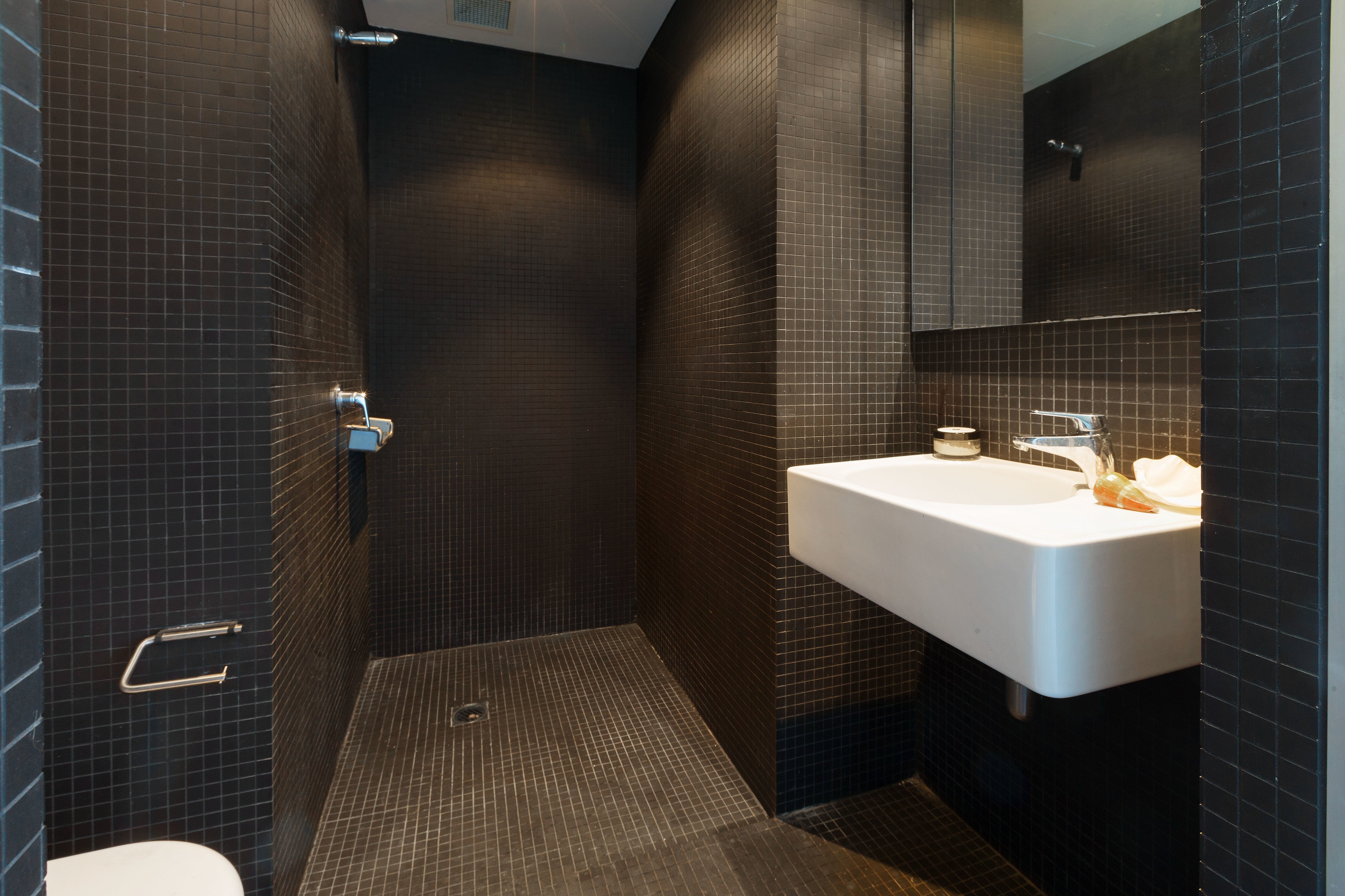 * Glass mosaic bathroom, European style internal laundry