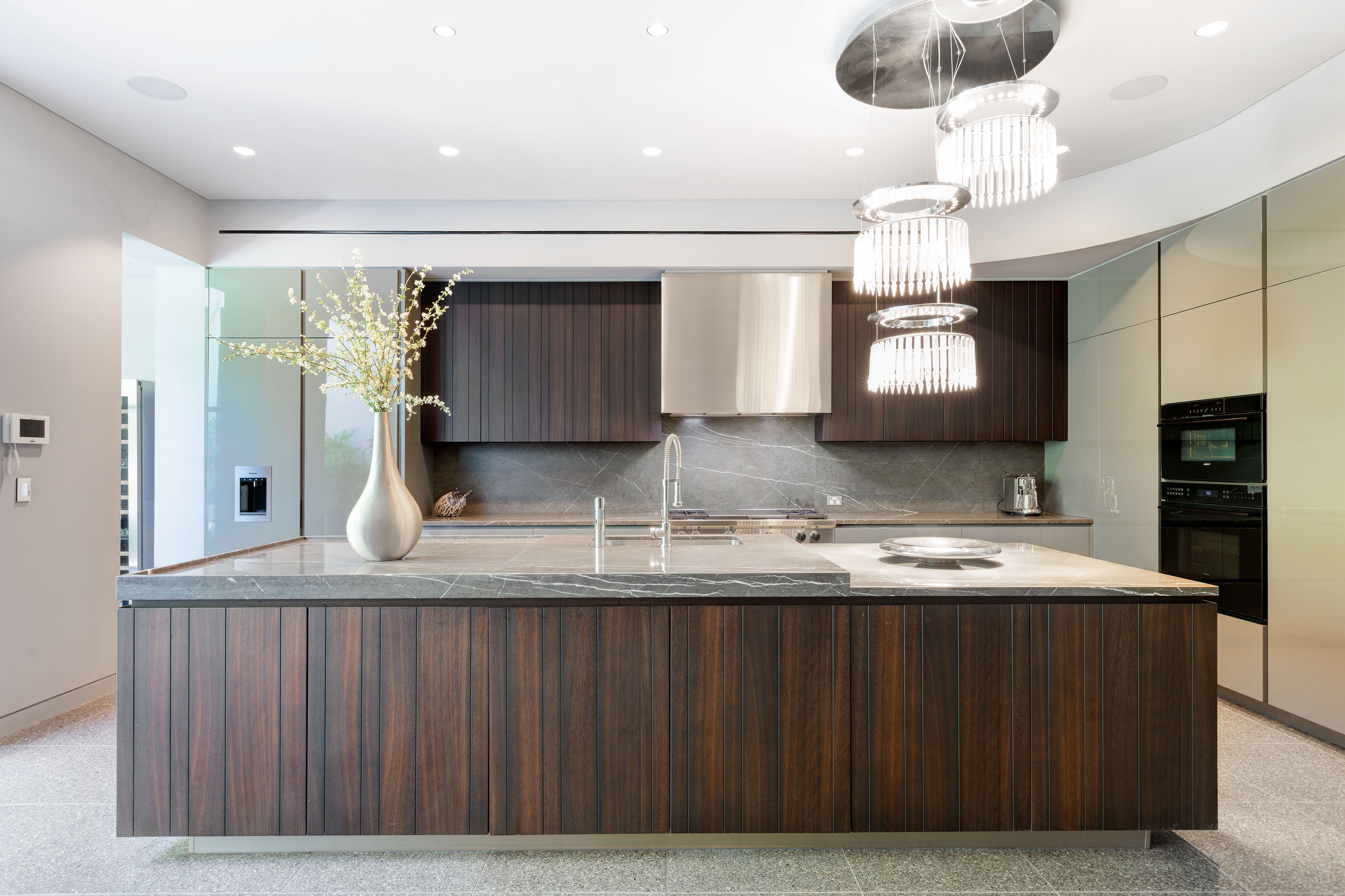 - Showpiece entertainer's kitchen with marble island and Wolf appliances