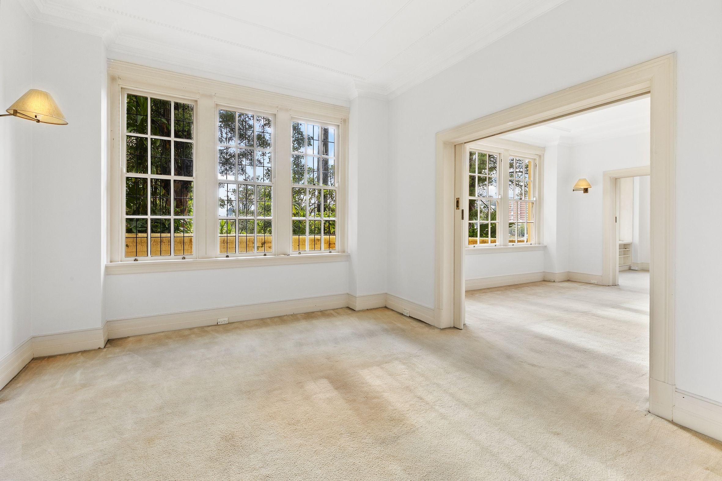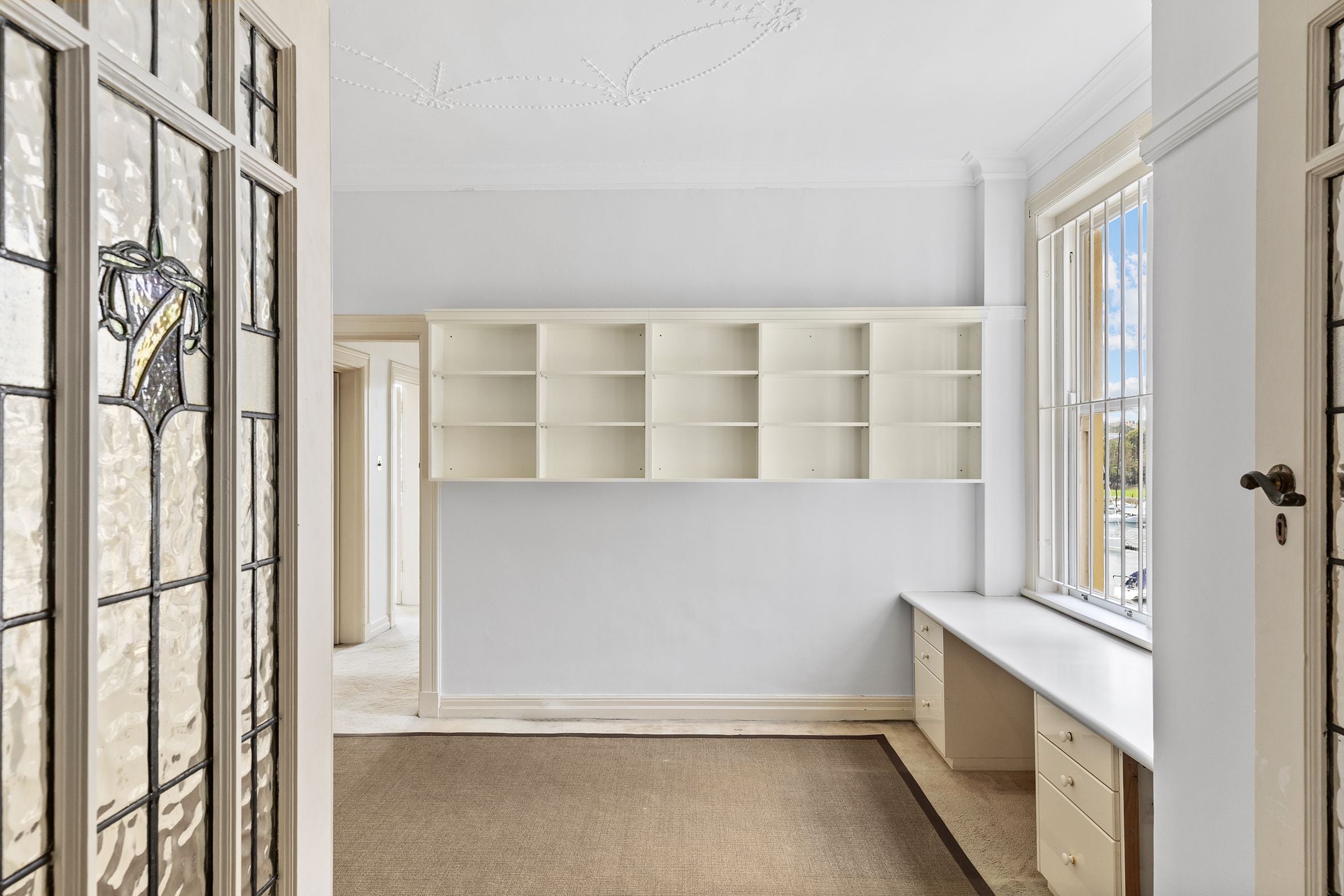 Stately living and dining domains, leadlight embellished French doors lead to a covered balcony gazing to Rushcutters Bay Park beyond the water. The interior space displays gracious hallmarks of an era bygone, all of which have been carefully maintained yet patiently await a creative mind to finesse and artfully revamp.