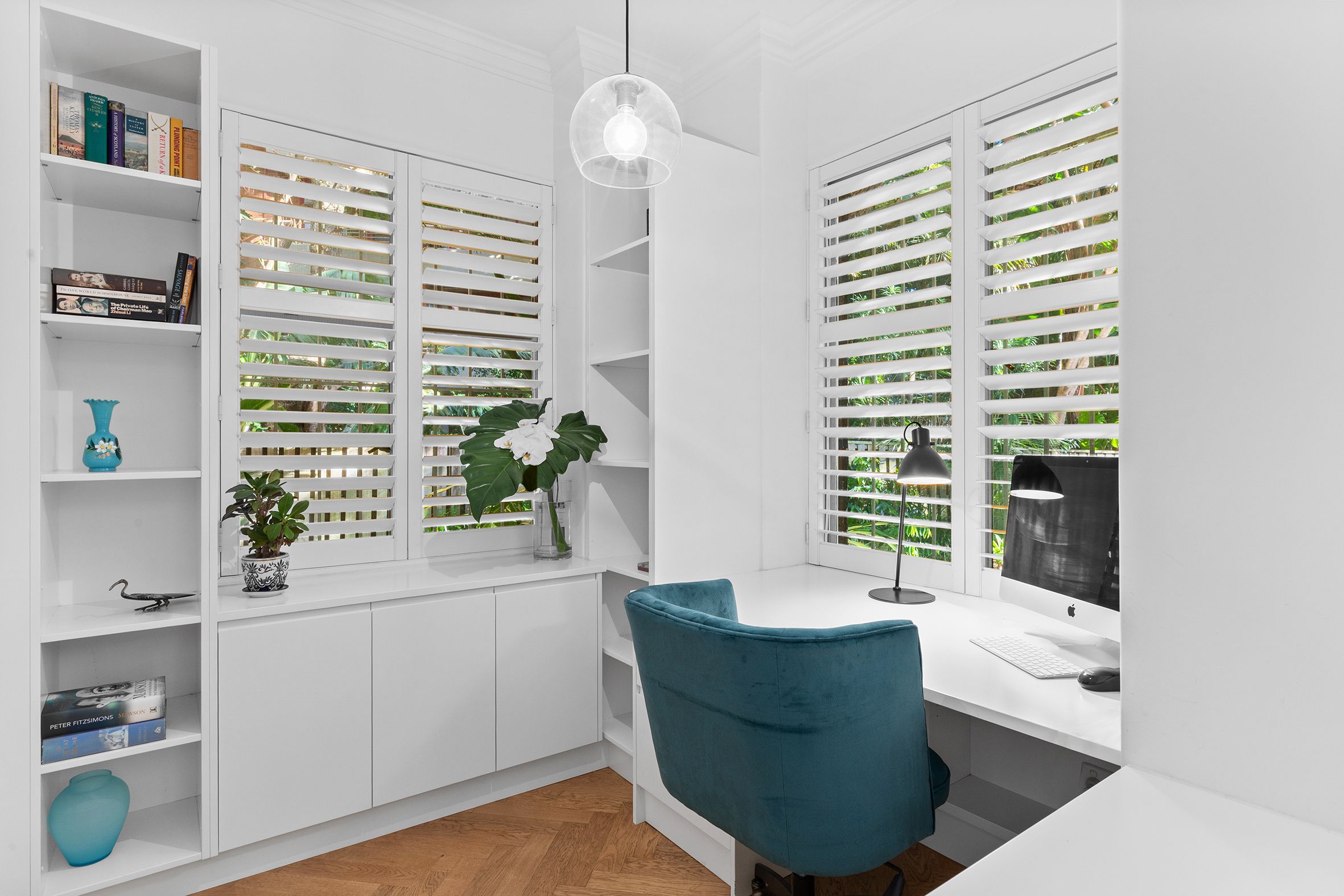 The spacious living / dining area enjoys windows on three sides, filling the home with garden outlooks and gentle cross-breezes in summer and central heating in the cooler months. Custom mirrored cabinetry seamlessly conceals the television, bookshelves and storage. Plantation shutters lend a clean, tailored finish and allow for flexible light control enhancing the home's serene, house-like feel.