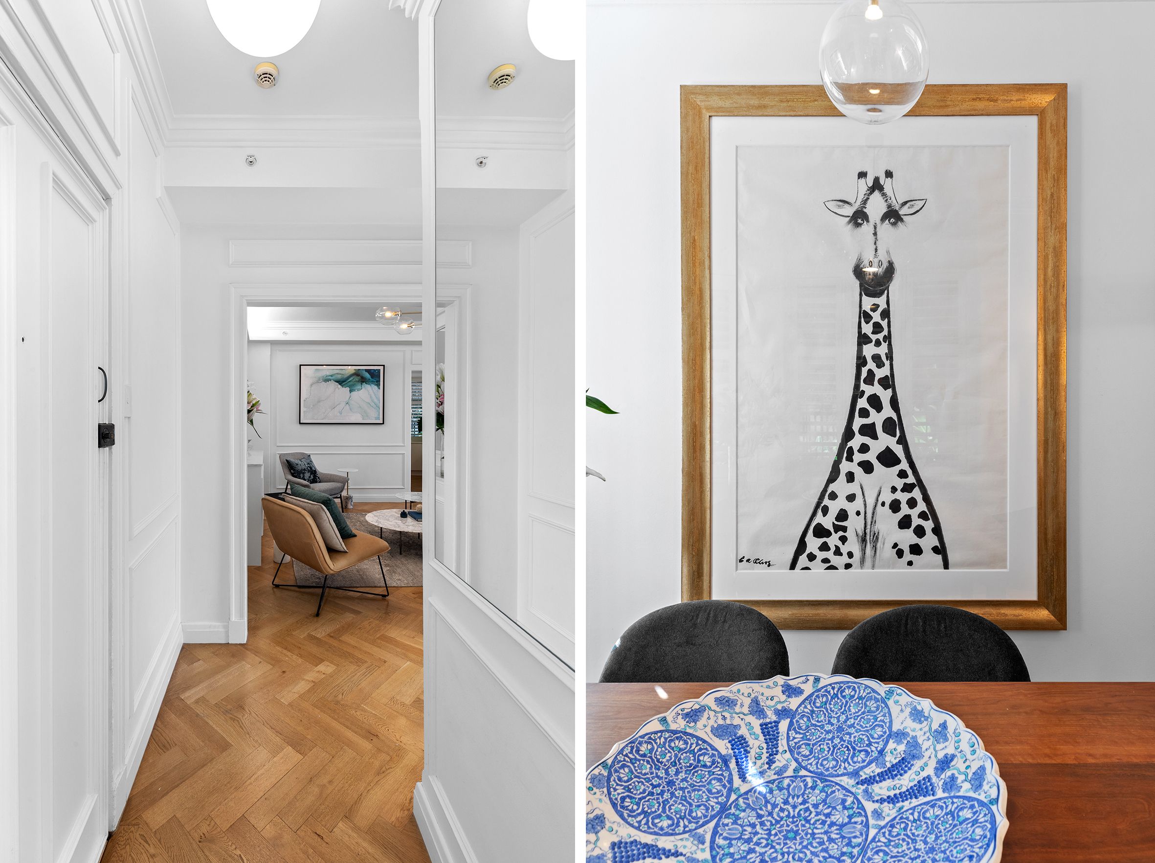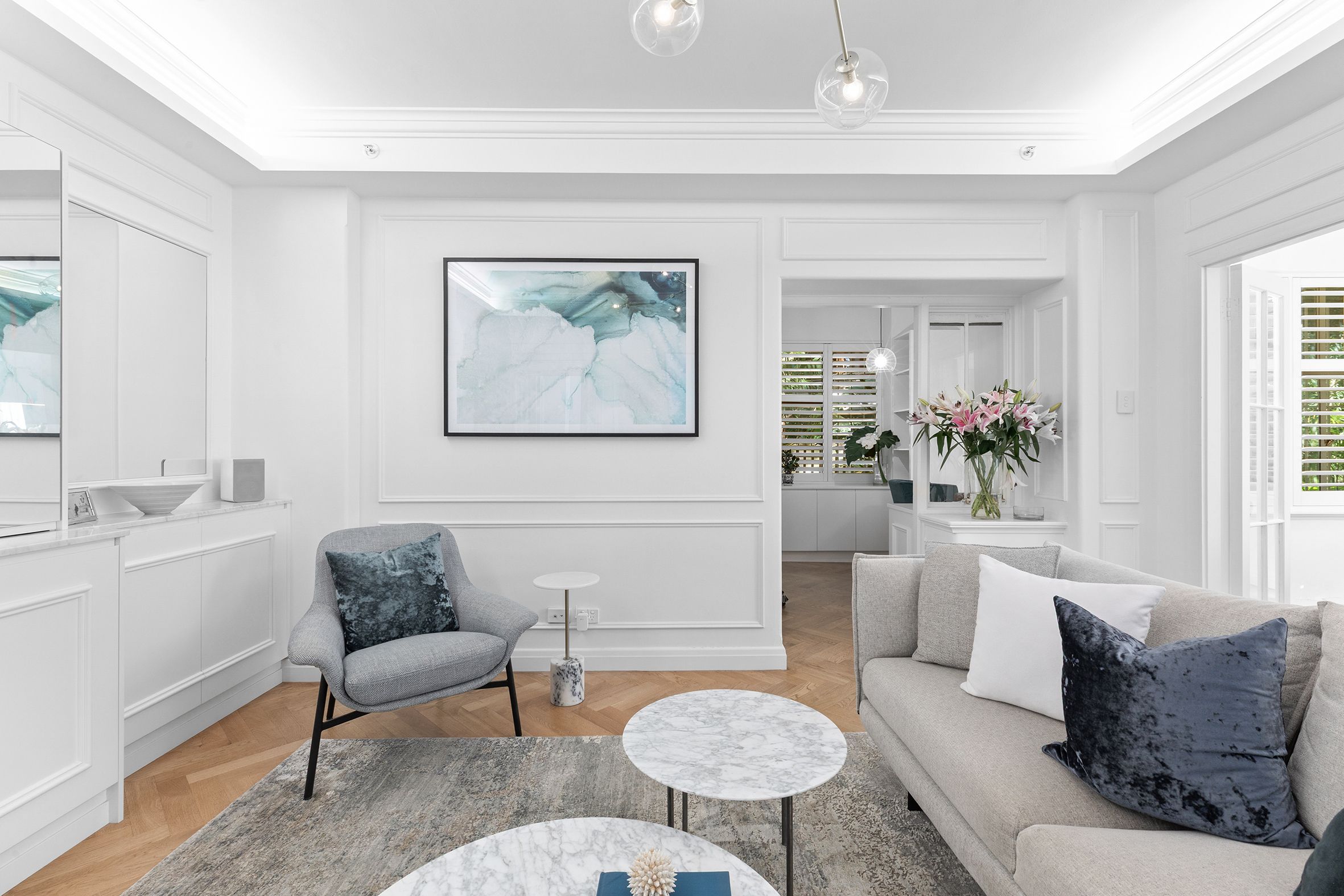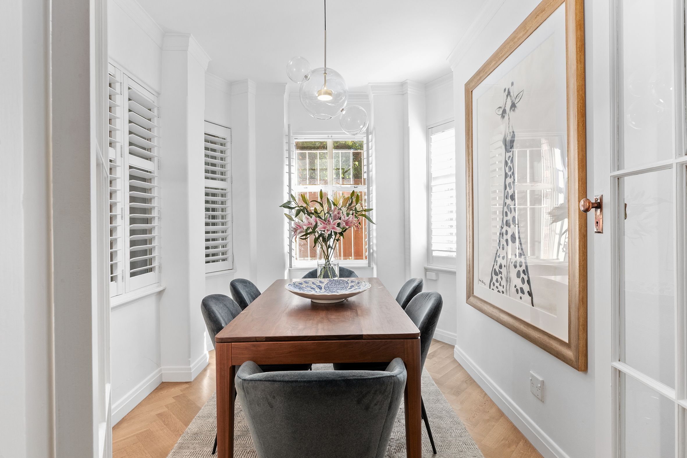 A refined interior palette is anchored by oak parquetry flooring laid in classic herringbone. High ceilings with decorative cornices enhance the sense of volume and light, while bespoke designer lighting adds warmth and sophistication throughout.
