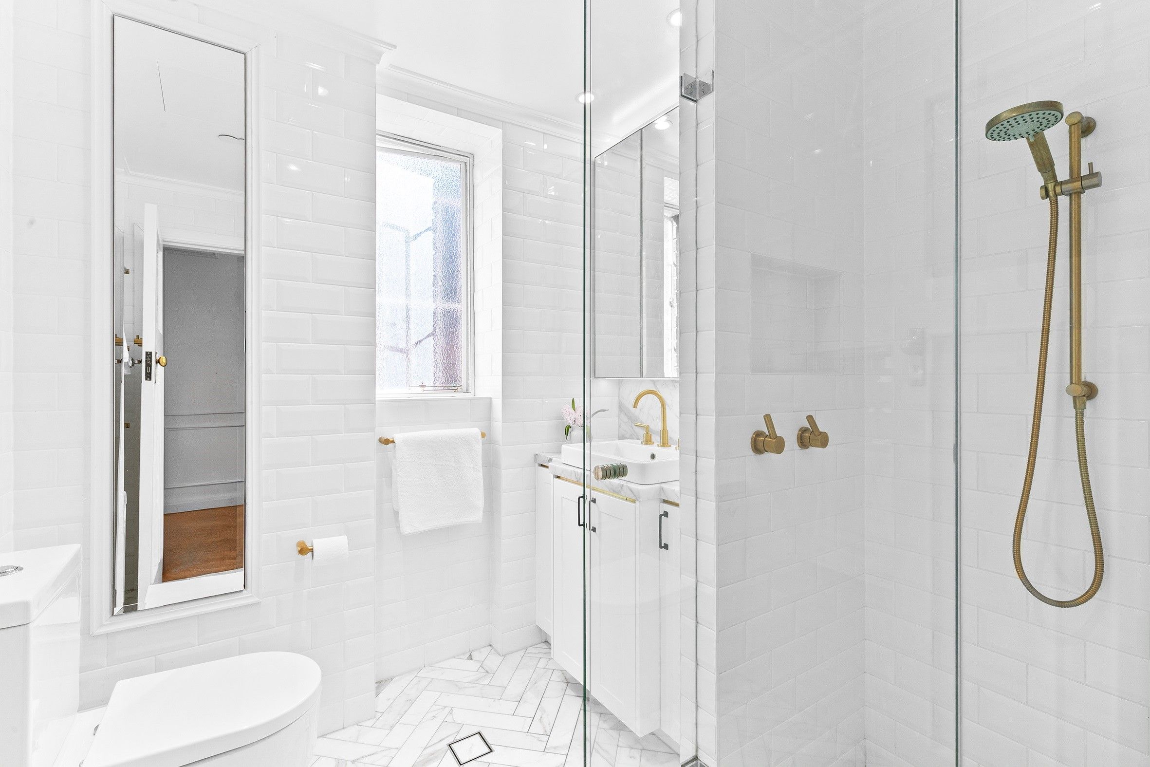 The beautifully renovated bathroom is a standout, finished with marble floor tiles and soft neutral tones. Gold-coloured tapware adds a hint of glamour, while built-in storage ensures a clutter-free space. Meticulous detailing throughout honours the building's heritage while delivering everyday comfort and style.