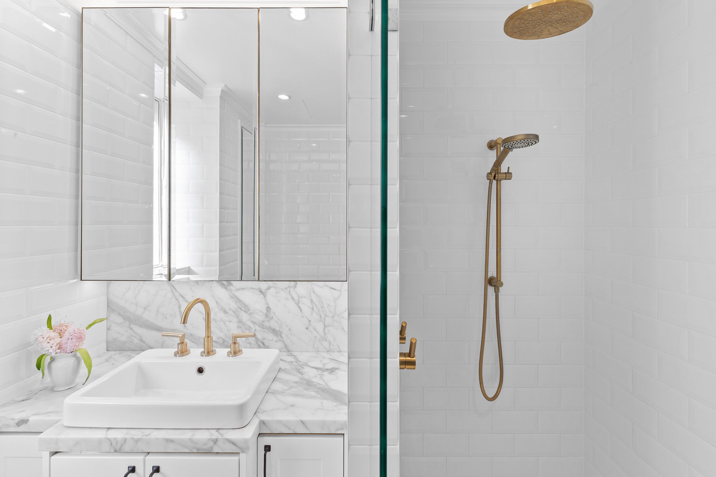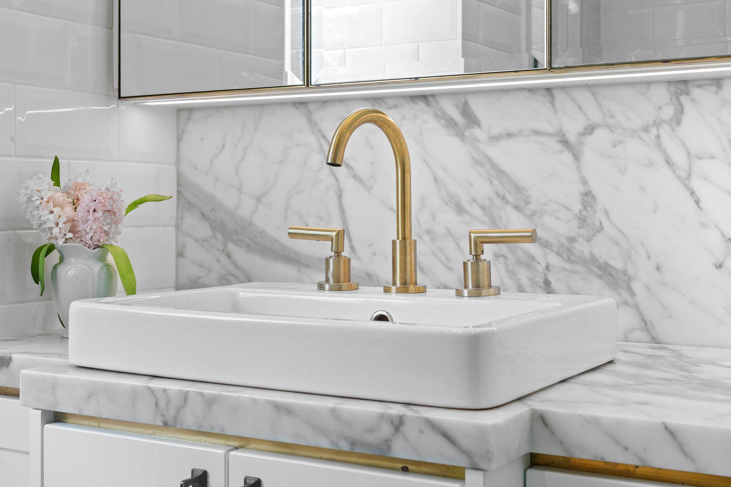 • Luxurious bathroom with marble floors, gold tapware and excellent storage