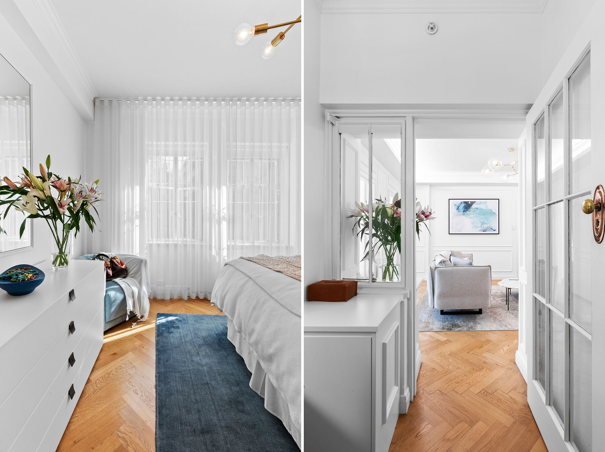 The generously scaled main bedroom features serene luxury curtains and blinds with a large built-in wardrobe with interior lighting. The separate study offers a quiet retreat for work or reading with exceptional custom storage and shelving. French doors open to a versatile second room, equally suited to formal dining, guest accommodation or a second bedroom.