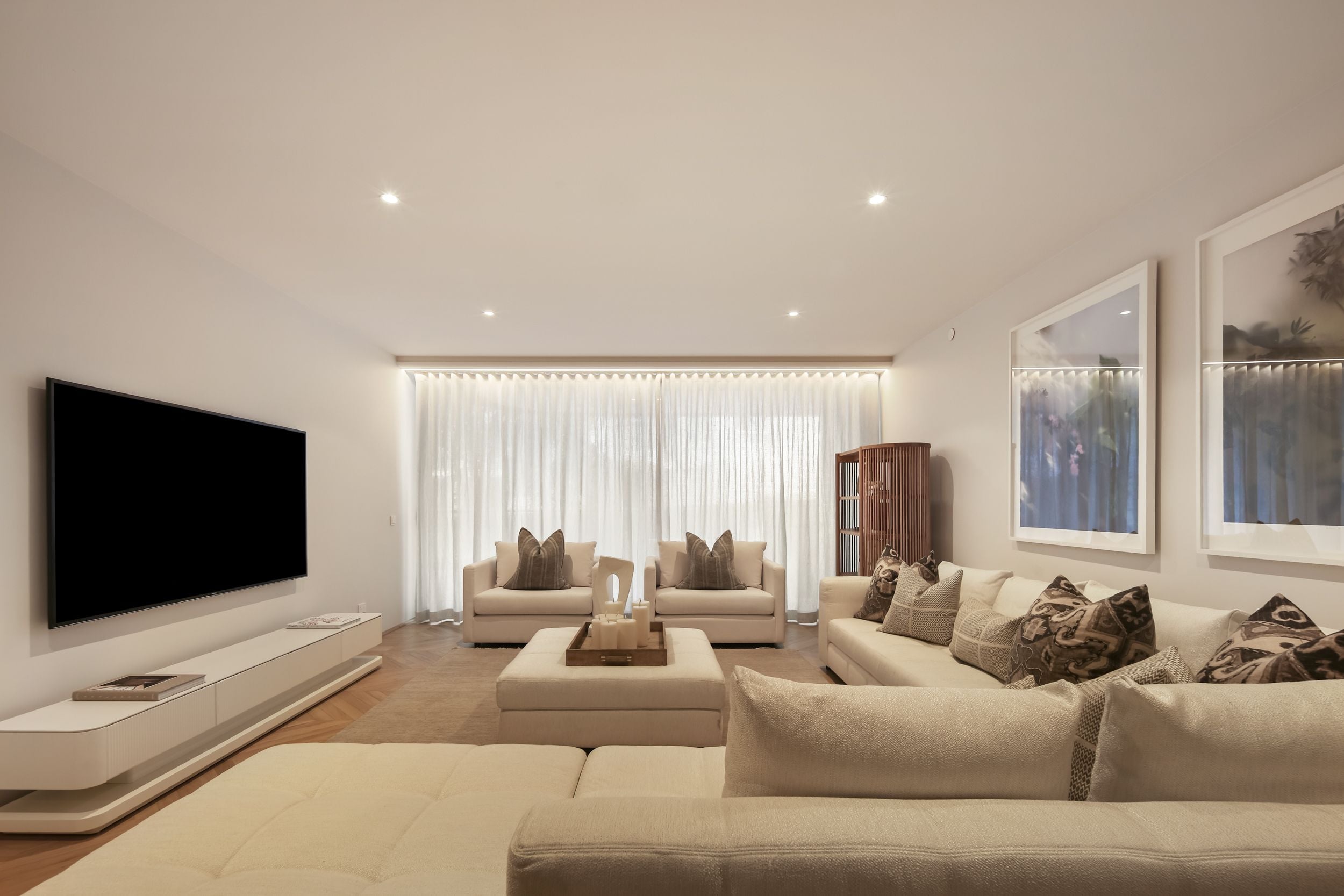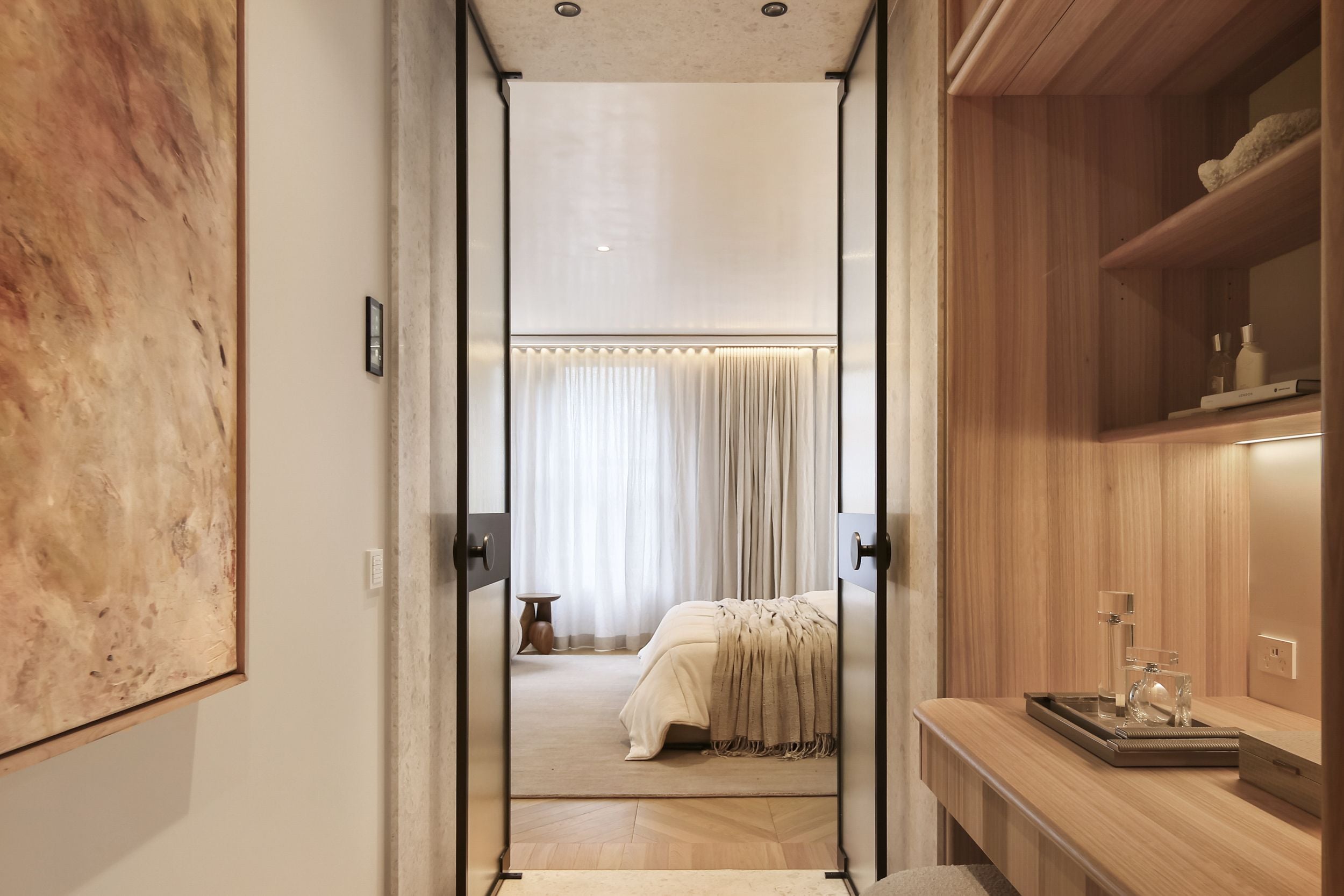 Bedrooms provide refined comfort with plush carpets and extensive joinery, while the ensuites are finished in patterned marble, with heated floors and and detail that evokes the atmosphere of a private spa retreat.