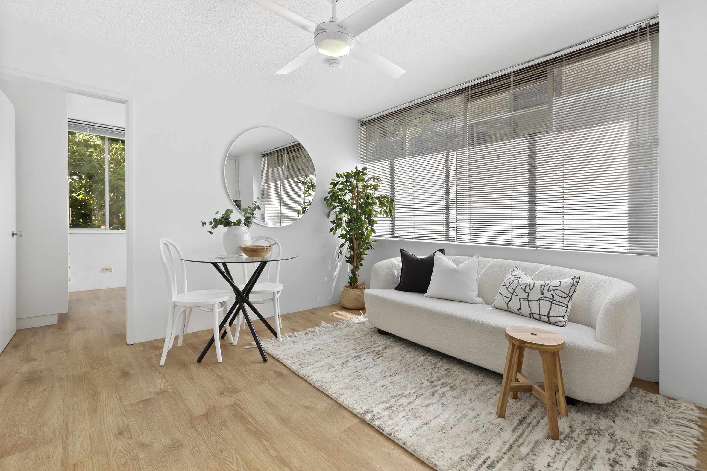 > Timber look flooring. Ceiling fan