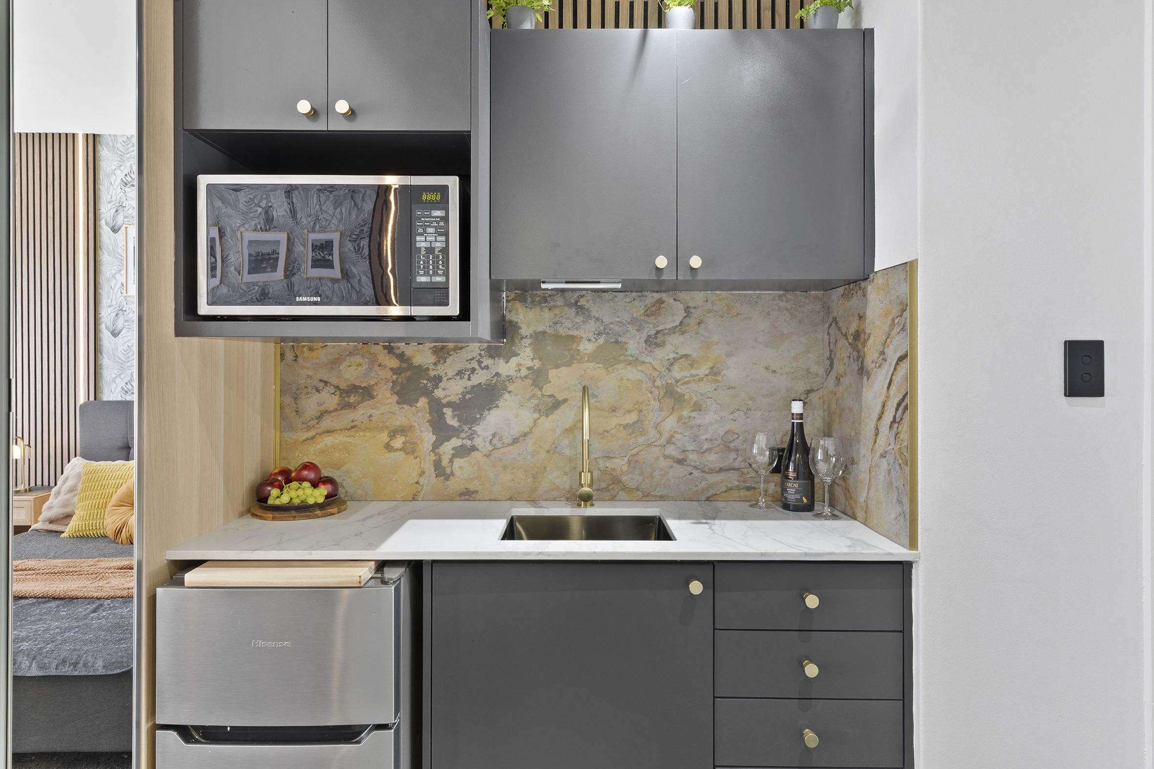 • Stone benchtop, unique stone splashback and timber panelling