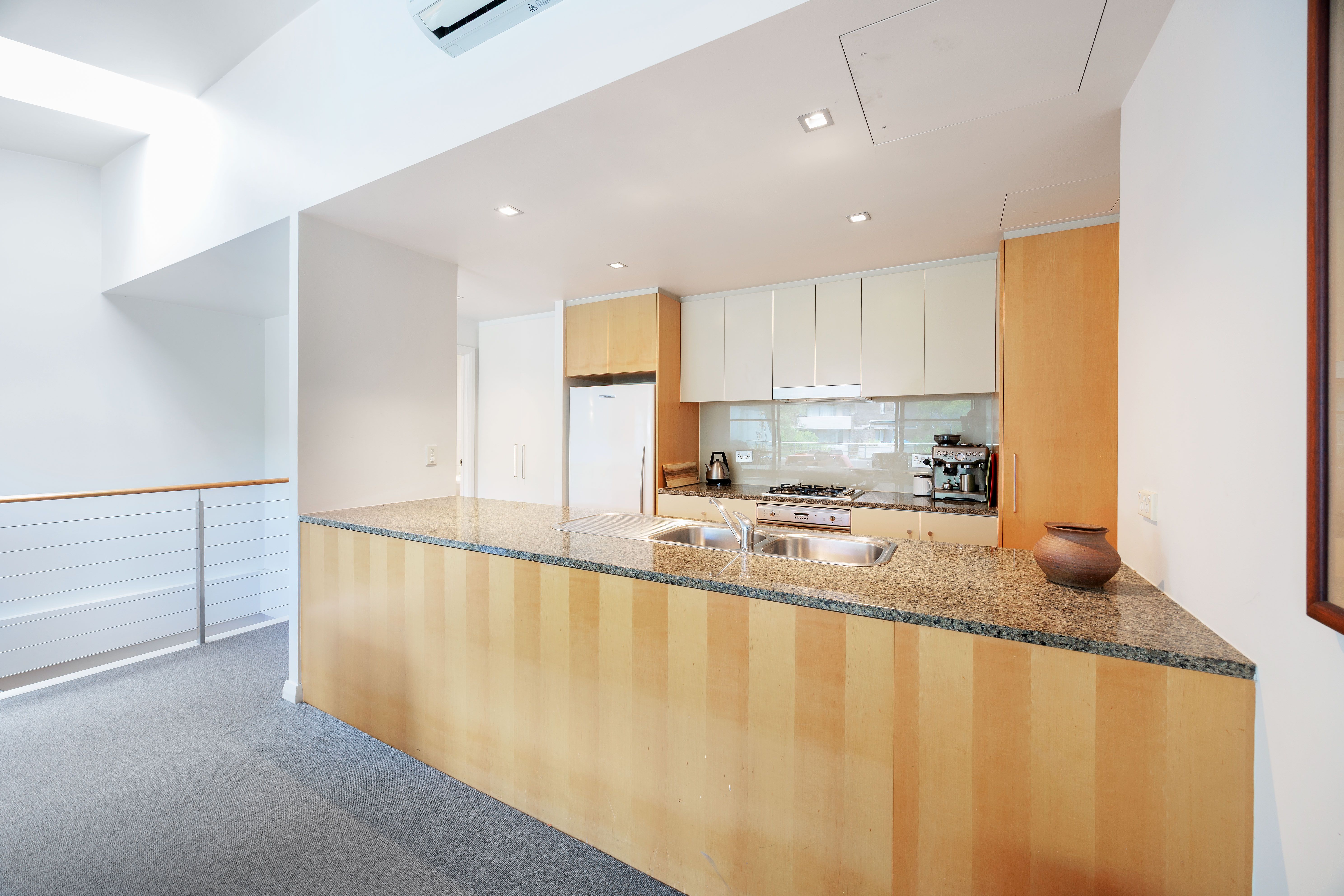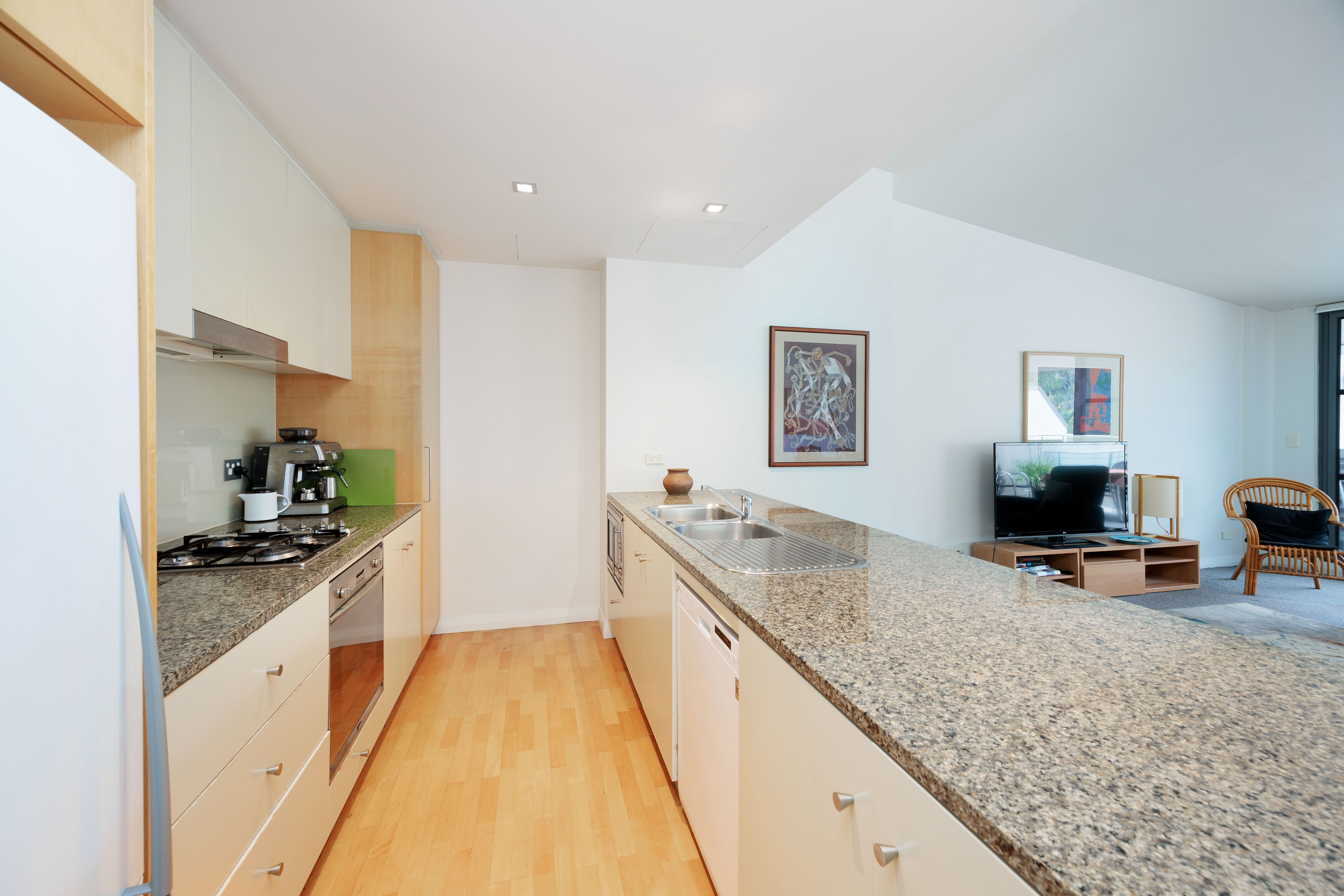 * Large kitchen, stone benches, integrated dishwasher