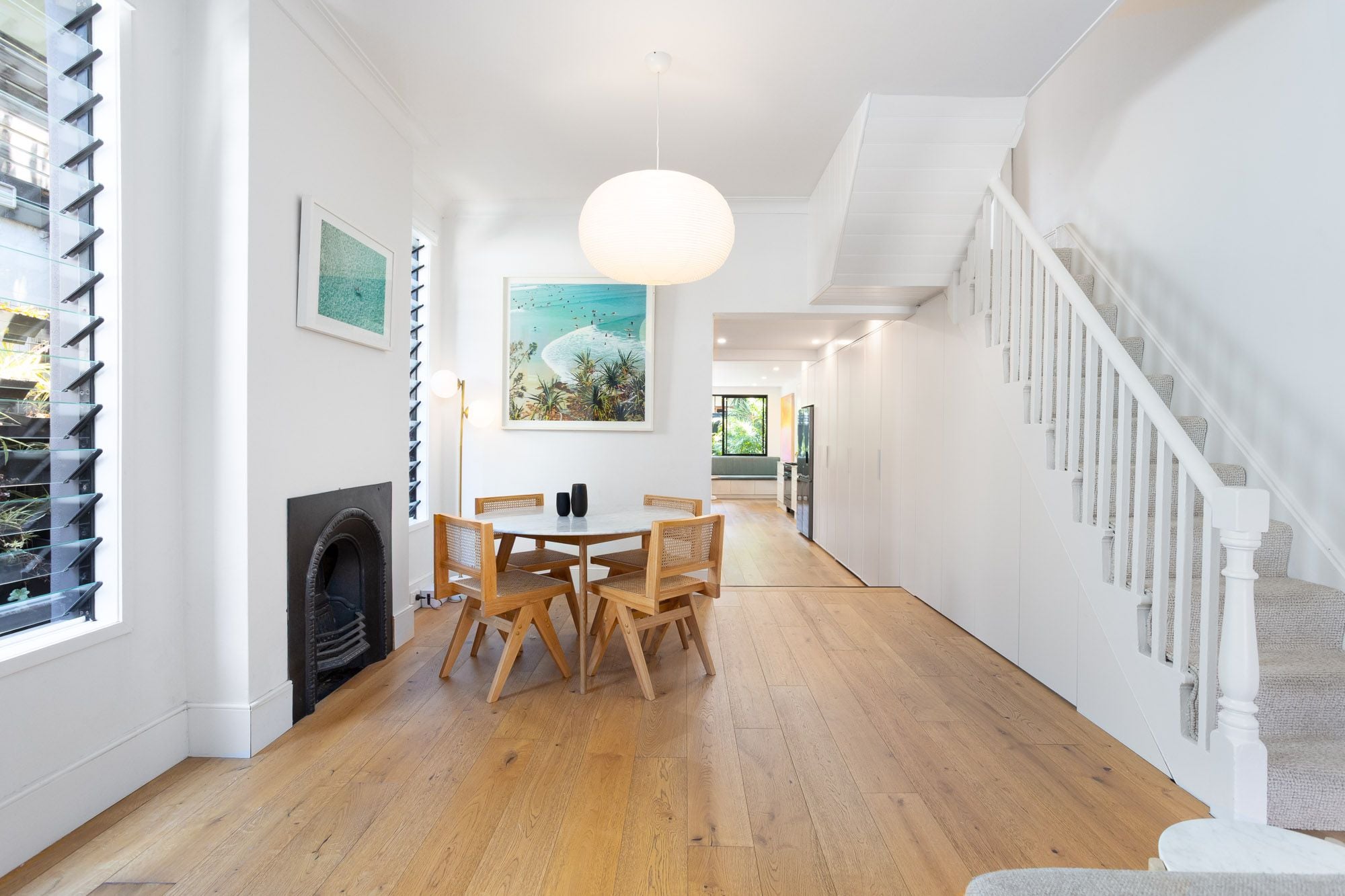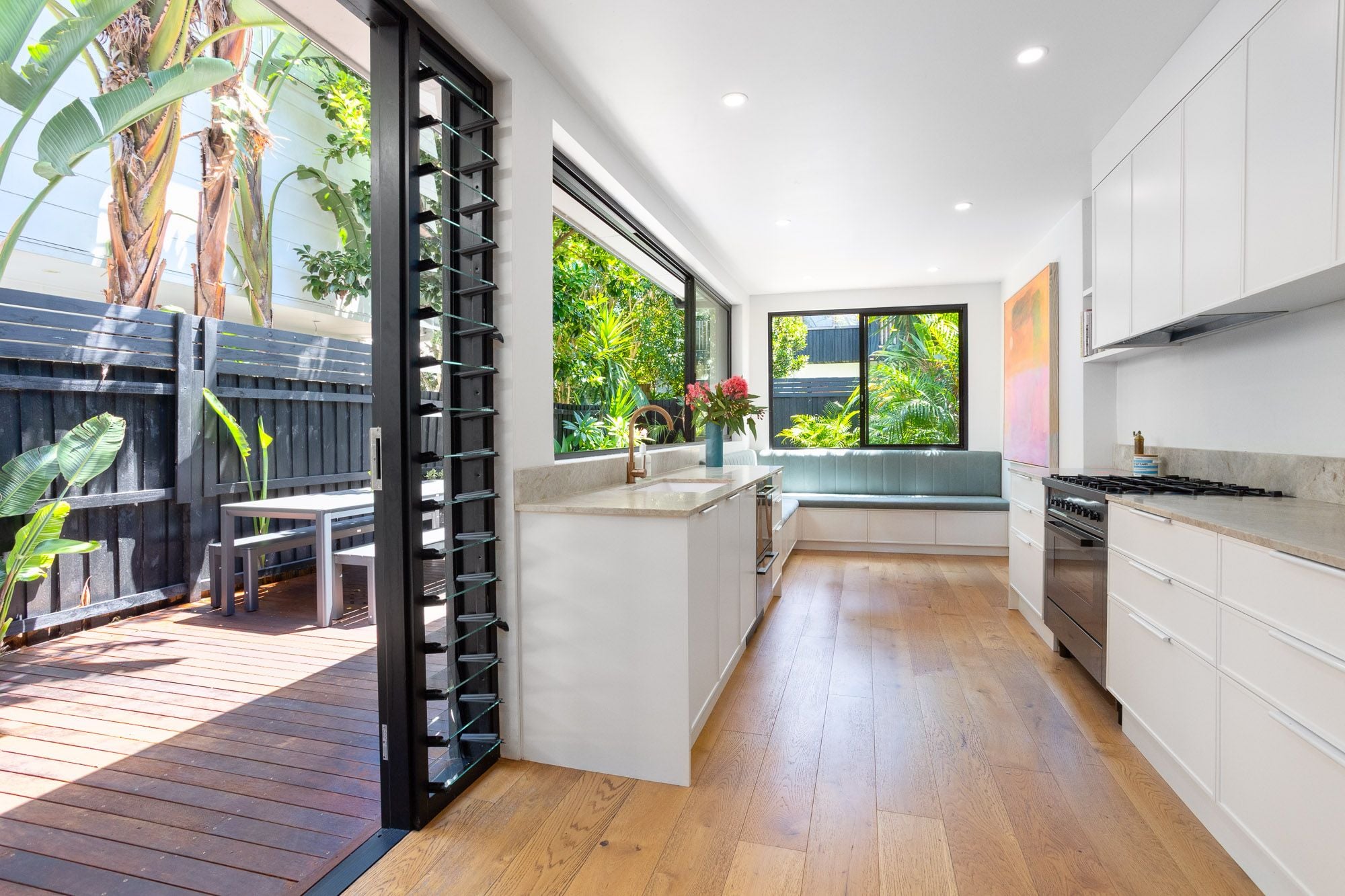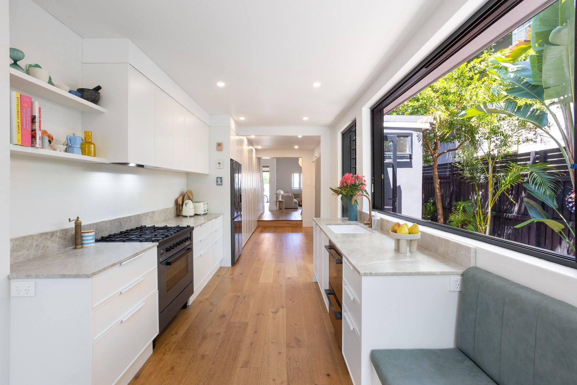 Framed by engineered oak flooring and high ceilings, the spacious open-plan living and dining offers easy entertaining and the perfect place to unwind, while to the rear a sophisticated redesign showcases the light-filled kitchen. Taj Mahal stone counters and Ilve gas cooking are supported by custom cabinetry with integrated appliances, while a bespoke banquette forms a casual dining space beneath huge garden windows. Upstairs, the main bedroom offers a bright E-facing retreat, with additional study alcove and ocean glimpses, with 2 further bedrooms enhanced by leafy outlooks.
