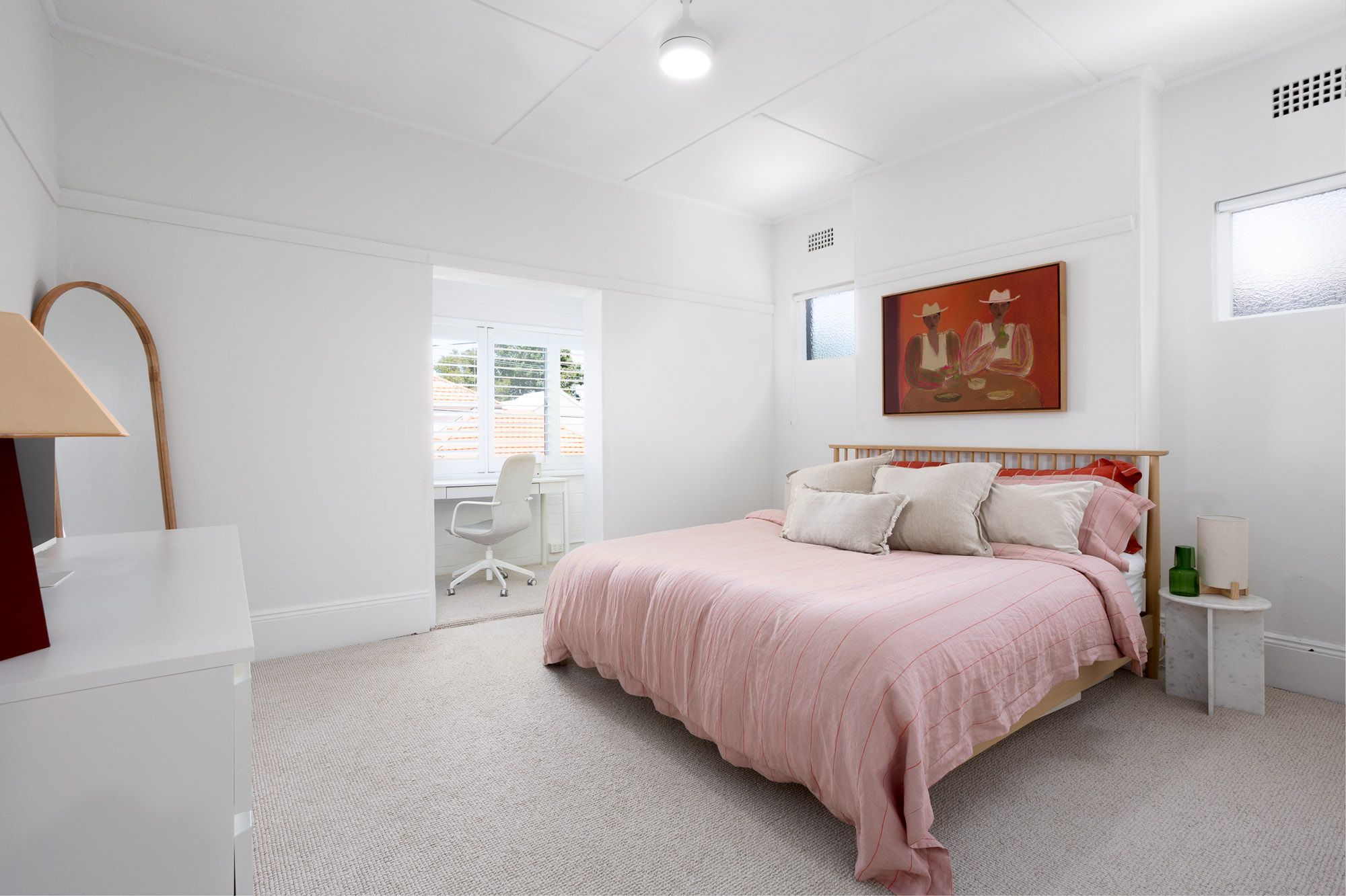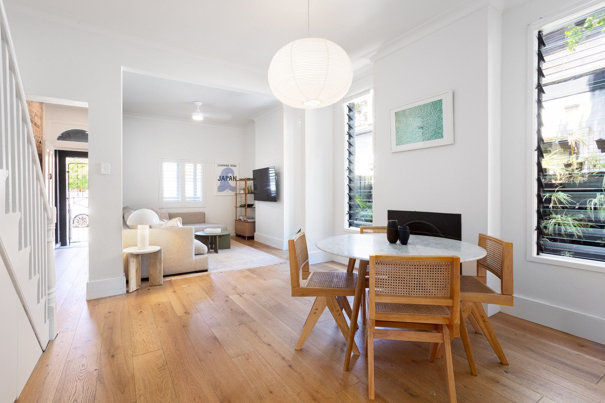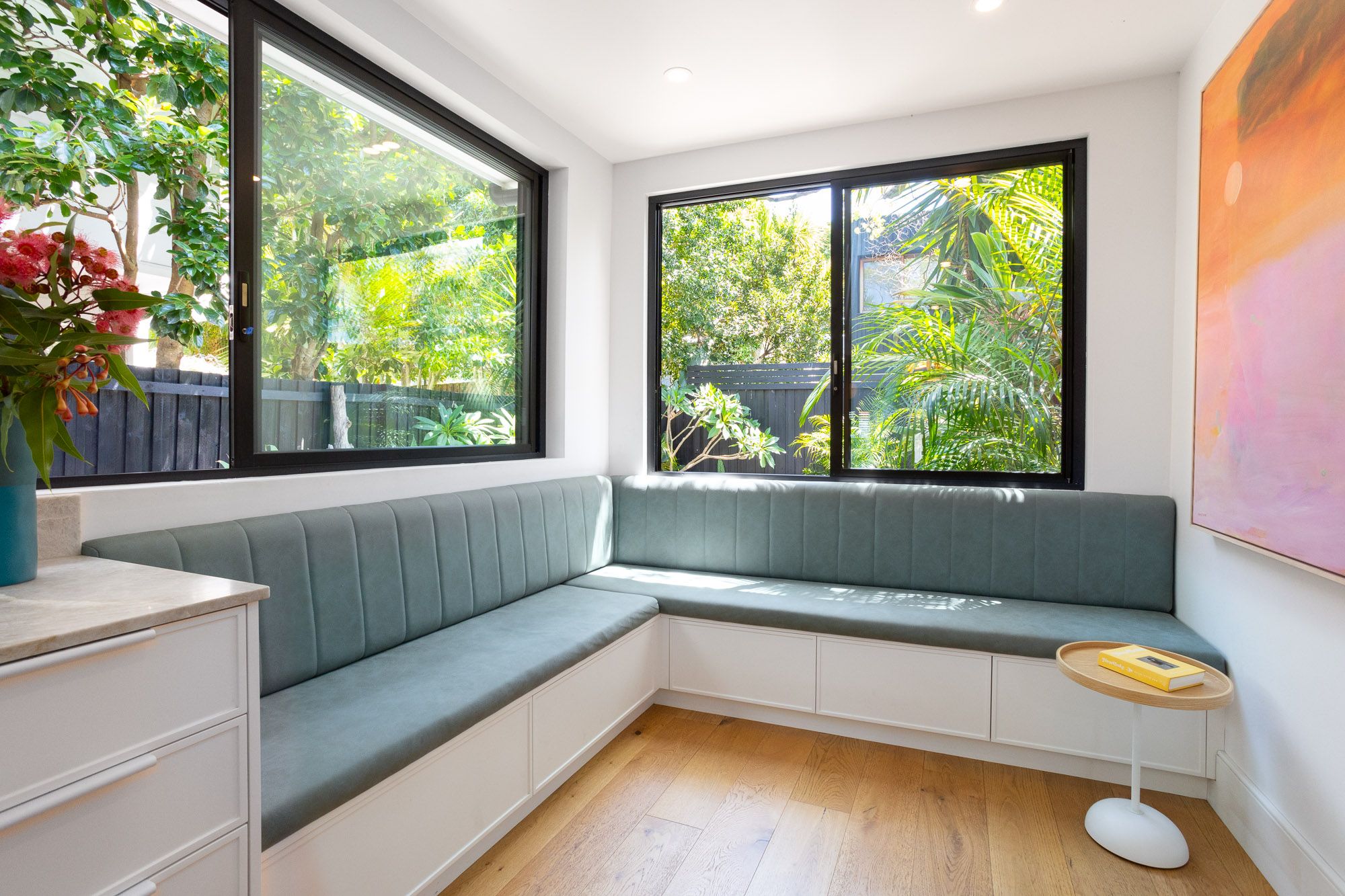 Framed by engineered oak flooring and high ceilings, the spacious open-plan living and dining offers easy entertaining and the perfect place to unwind, while to the rear a sophisticated redesign showcases the light-filled kitchen. Taj Mahal stone counters and Ilve gas cooking are supported by custom cabinetry with integrated appliances, while a bespoke banquette forms a casual dining space beneath huge garden windows. Upstairs, the main bedroom offers a bright E-facing retreat, with additional study alcove and ocean glimpses, with 2 further bedrooms enhanced by leafy outlooks.
