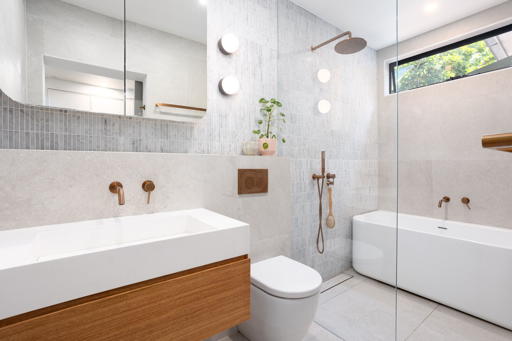 - Chic brushed copper tapware throughout