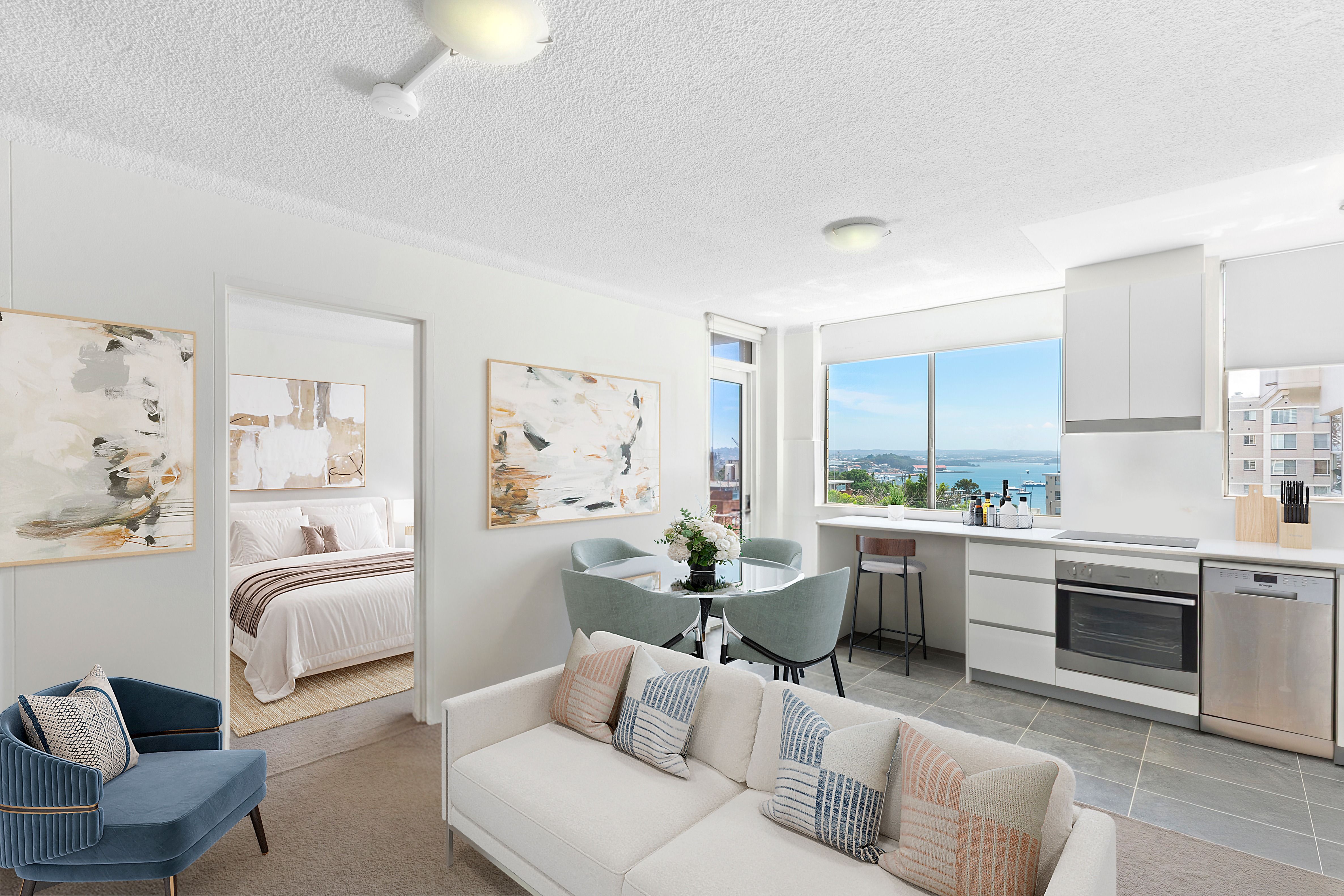 Bathed in soft eastern light with harbour views from the living area, kitchen and bedroom, this inviting one-bedroom apartment offers an exceptional blend of outlook, light and lifestyle. Designed for easy living, both the living space and bedroom enjoy direct balcony access, creating a seamless indoor–outdoor connection and a wonderful sense of openness.