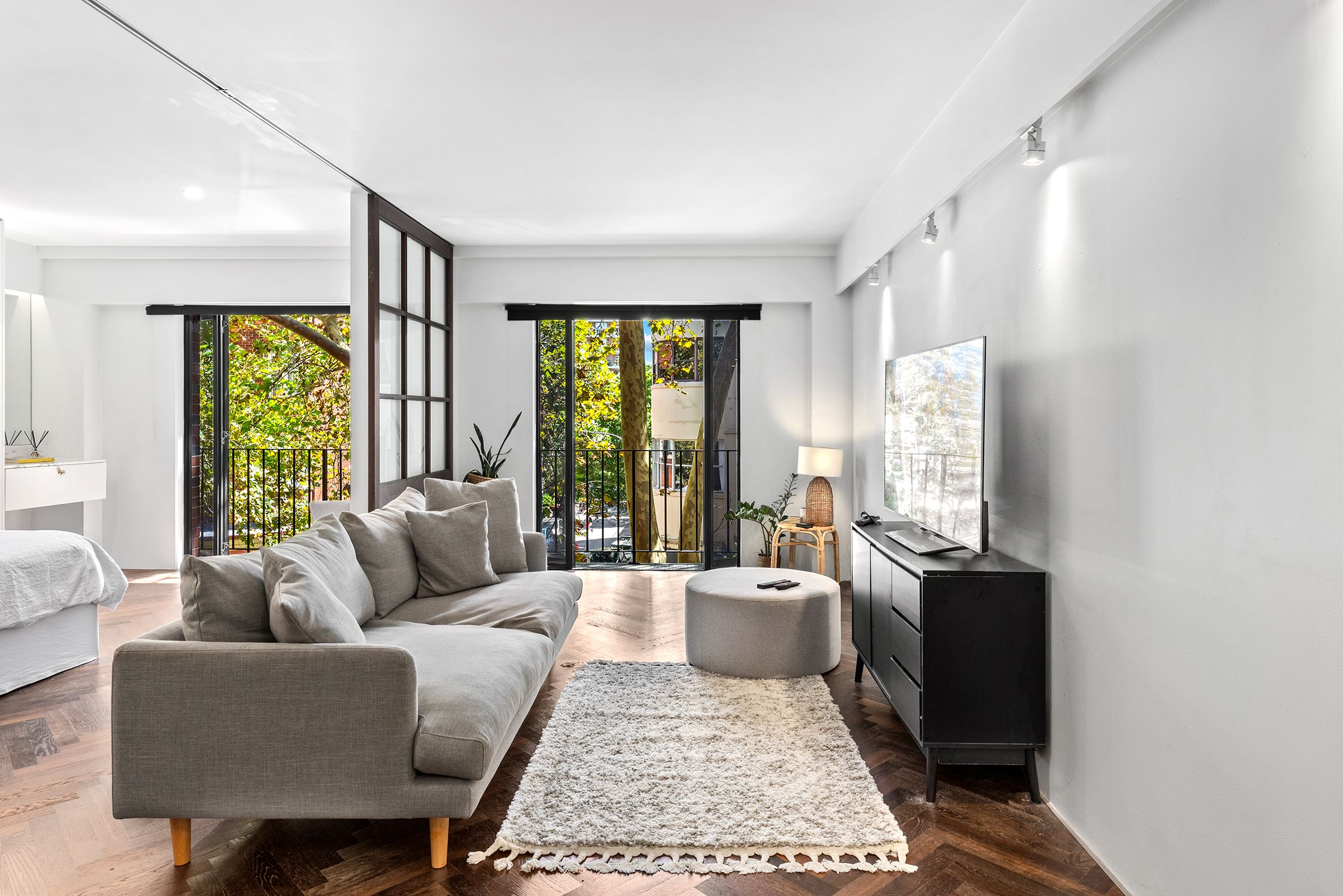 The open-plan living and dining area is enhanced by herringbone timber flooring and flows through French doors to a Juliet balcony, creating a light-filled and inviting space. The sleek kitchen features stone benchtops, induction cooking, and integrated appliances, while a study nook adds a practical touch for working from home.