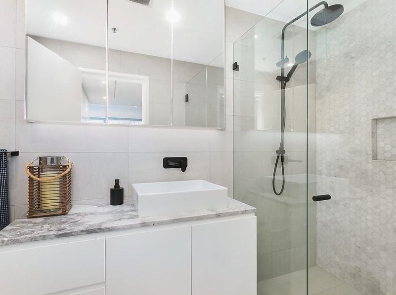 - Chic modern bathroom, adjacent laundry