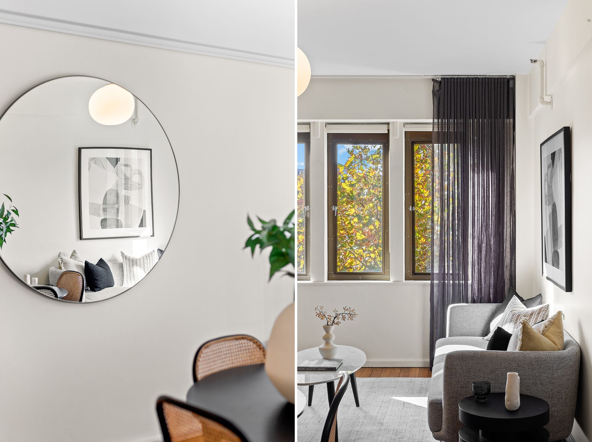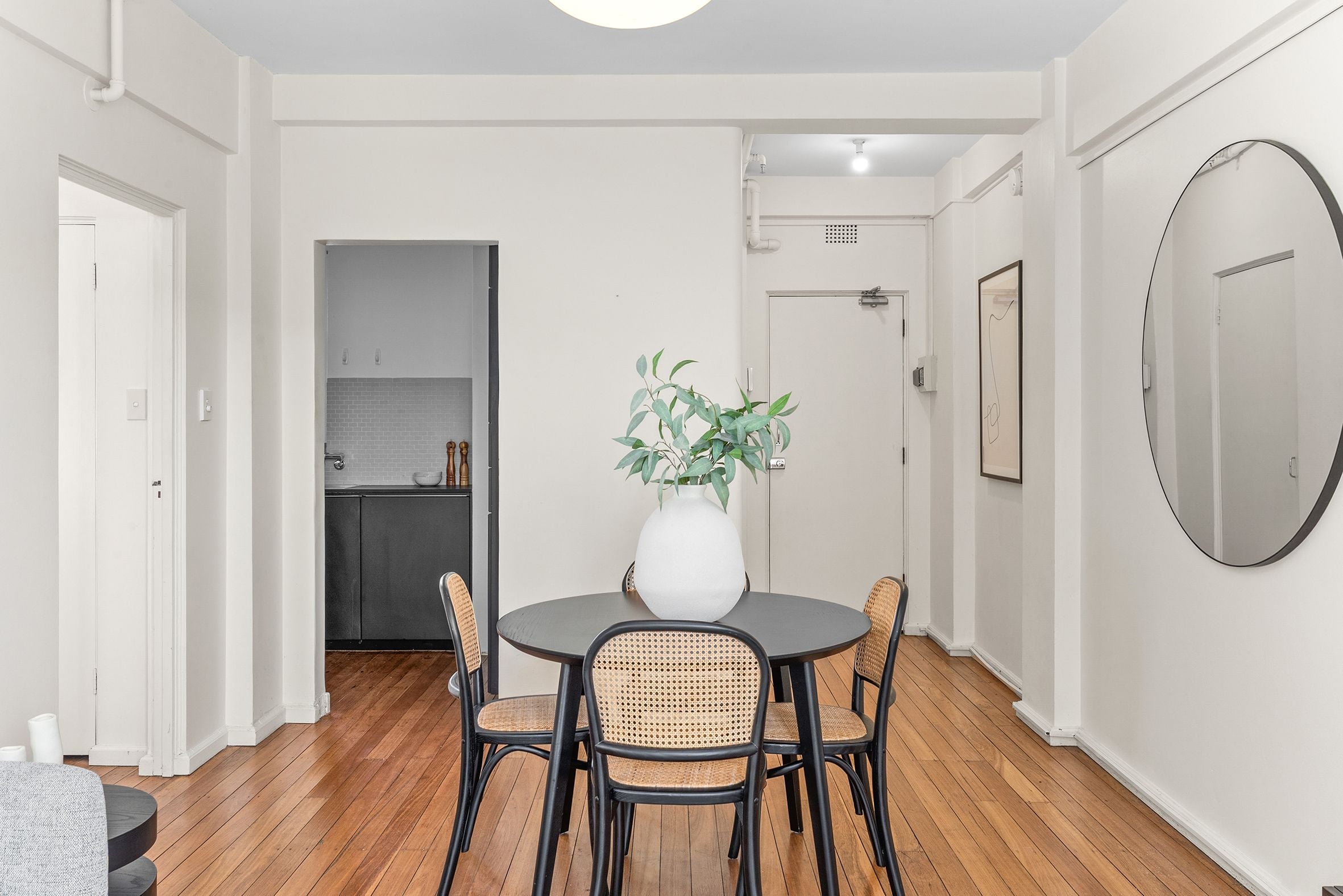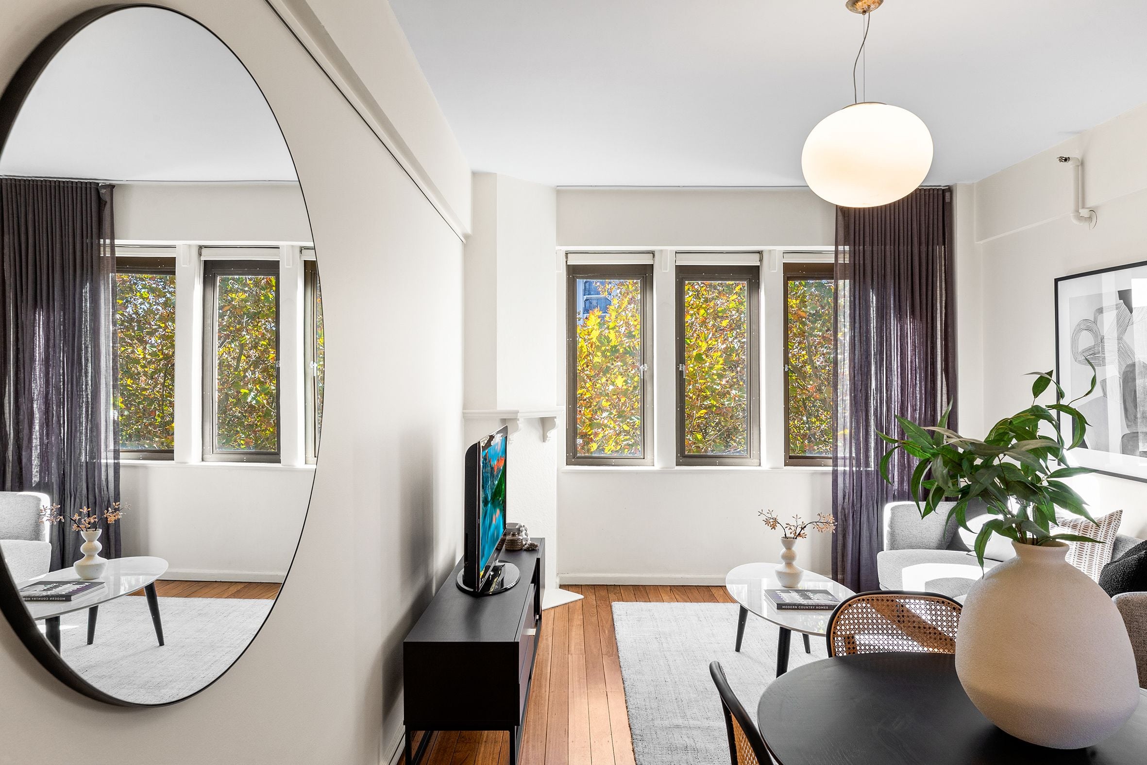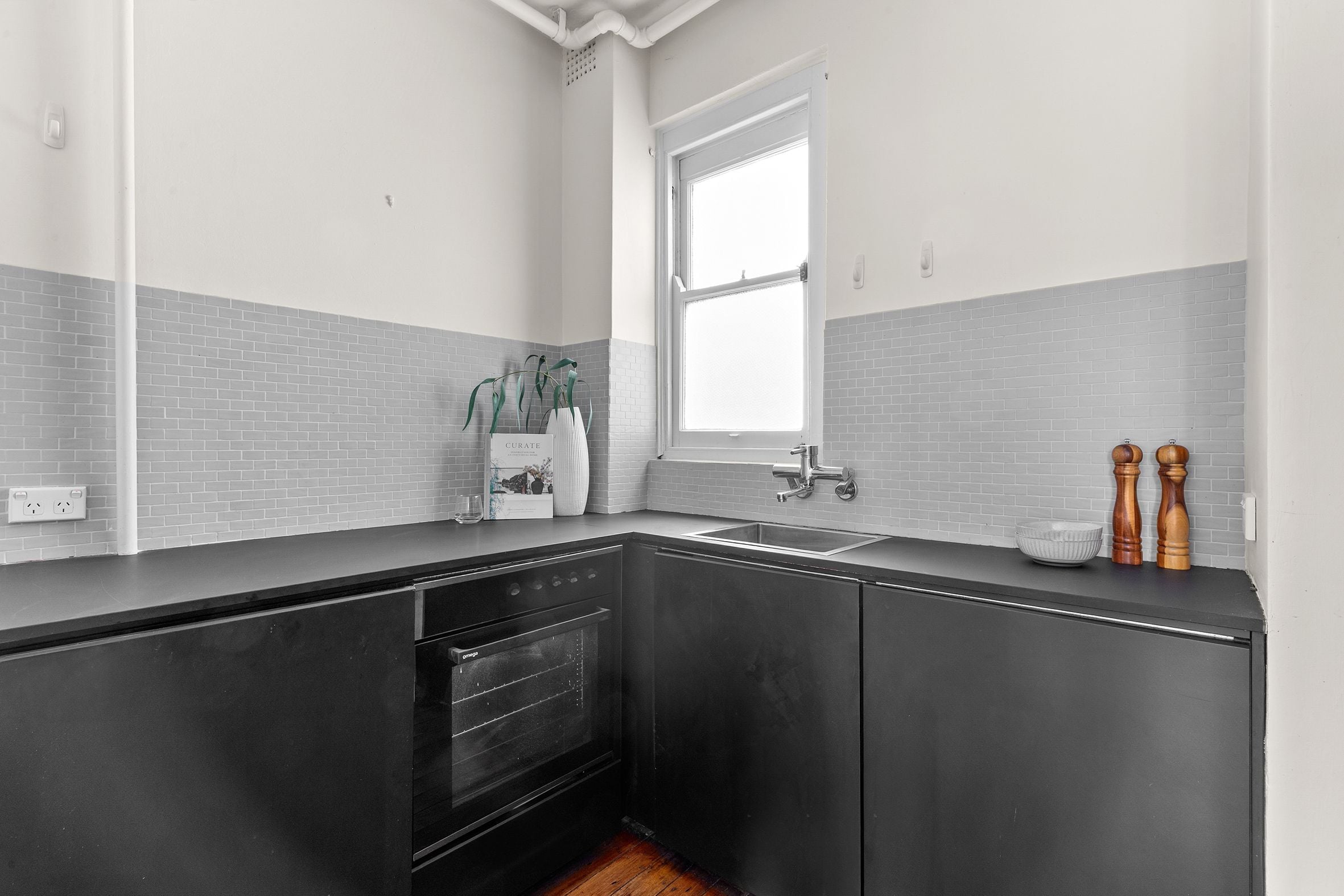 The generous living space is bright and welcoming, while the adjoining kitchen enjoys pleasant city glimpses that add a dynamic urban element to the home. The bathroom also benefits from its own city outlook and a conveniently located linen cupboard provides valuable additional storage. Quiet, comfortable and filled with natural light, the apartment presents an appealing opportunity within one of the area's most admired period buildings.