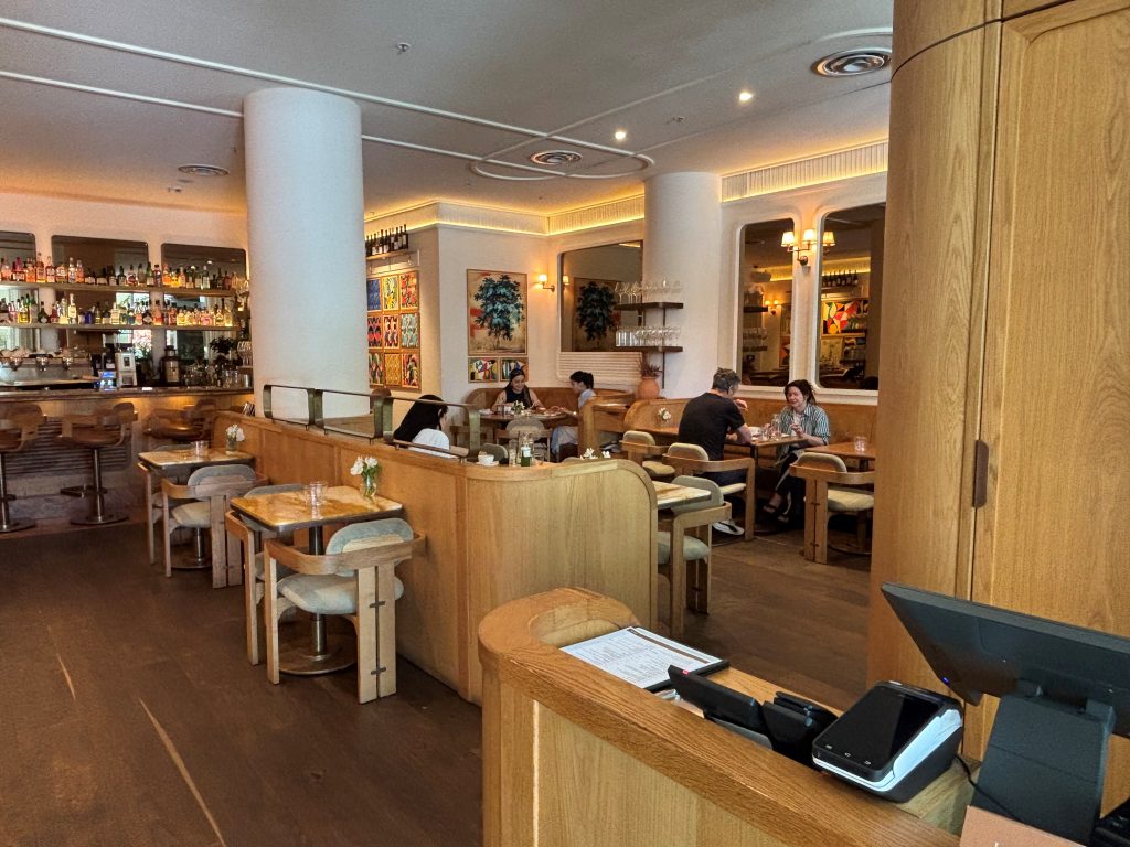 Caramel-coloured velvet banquettes, warm, honey-coloured, curved woodwork and uber-stylish chairs all create an atmosphere.